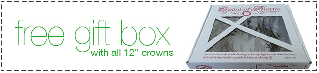 All of these crowns are hand twisted using real thorns from real trees. The thorns are sharp; they range in length from one inch to three inches, and vary in color from dark maroon, to brown and red, depending on the season of the year harvested. Each crown is completely unique, reflecting its own witness, touching the reality of suffering and pain and glorifying the Lamb of God. |